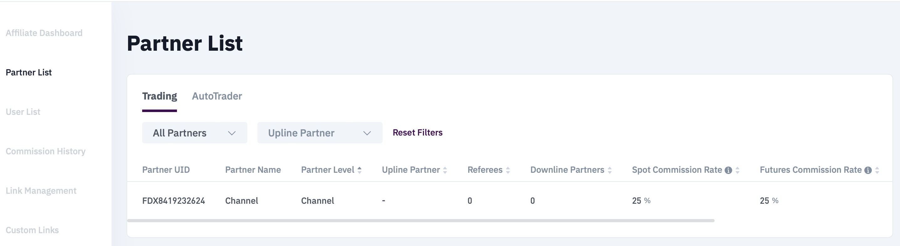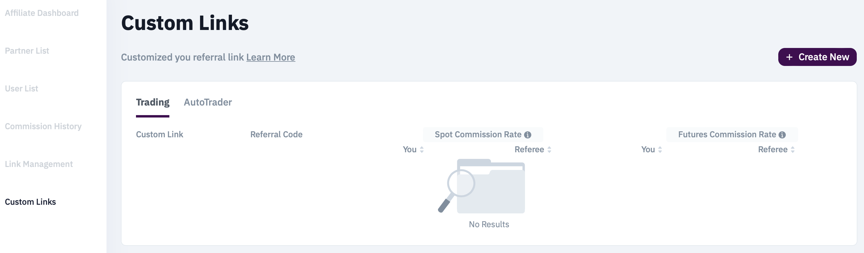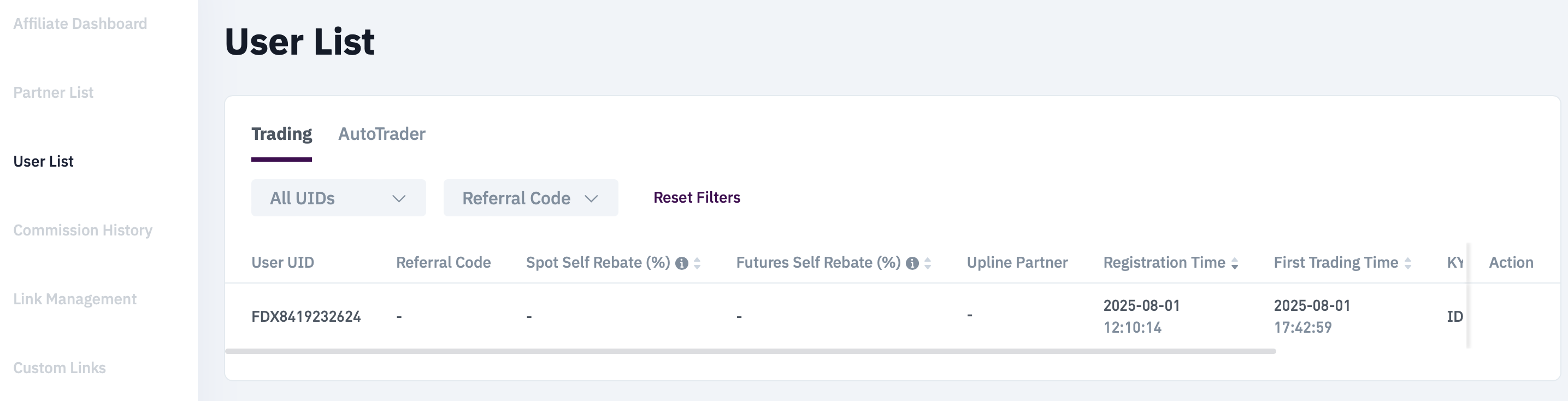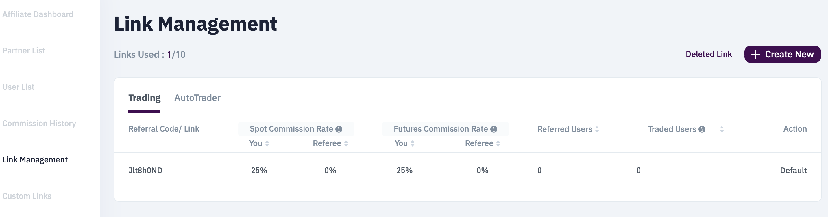 Each affiliate gets a unique referral link to share. When someone signs up and trades through that link, the affiliate earns a share of that user’s trading fees.