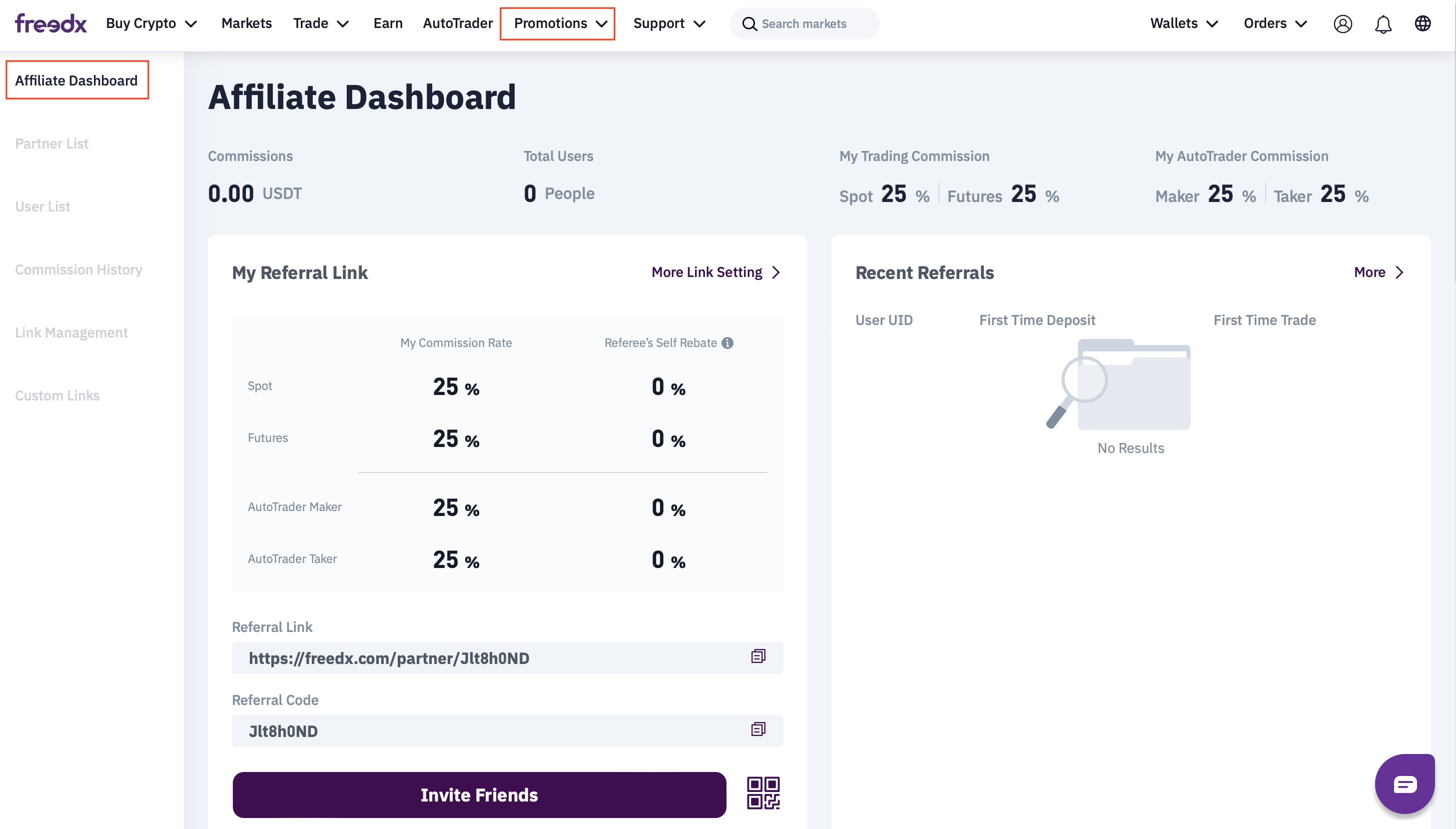 Tap “Promotions” from the top menu and select “Affiliate Program” You will be directed to the “Affiliate Dashboard,” where you can find your affiliate link, referral code, and commissions.